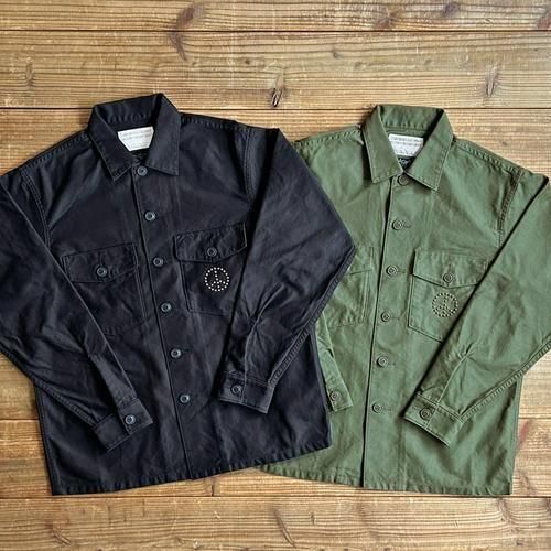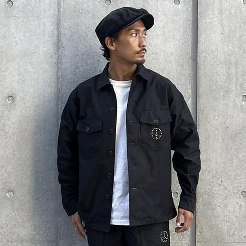 ミリタリーシャツの中でもアイコン的存在のアーミーシャツをベースに着やすいサイジングに仕上げたオリジナルのファティーグシャツに、「PEACE」マークのスタッズワークを施しました